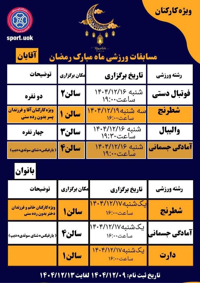 نحيط الزملاء الأعزاء علماً بأن مديرية التربية البدنية بالجامعة، وبمناسبة شهر رمضان المبارك، ستنظم ورشتي عمل تعليميتين لتعزيز المعرفة في مجالات التغذية وأصول النشاط البدني خلال الشهر الفضيل، بالإضافة إلى مسابقات رياضية في مختلف التخصصات مخصصة لموظفي الجامعة؛ وتجدون أدناه محاور ورش العمل وتفاصيل إقامة المسابقات.